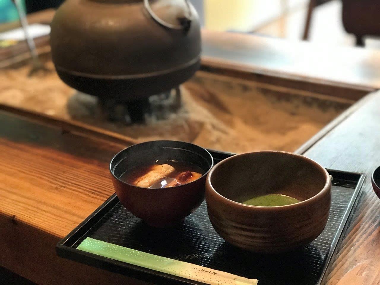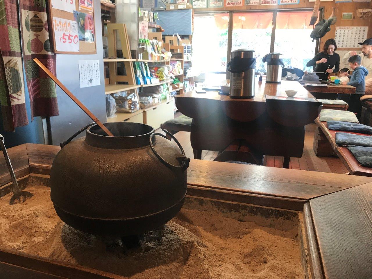 店に入るとすぐに出しくれたお茶はもちろん朝宮茶で、急須のお茶を飲み切ると囲炉裏にある釜から柄杓を使ってお湯を足します。