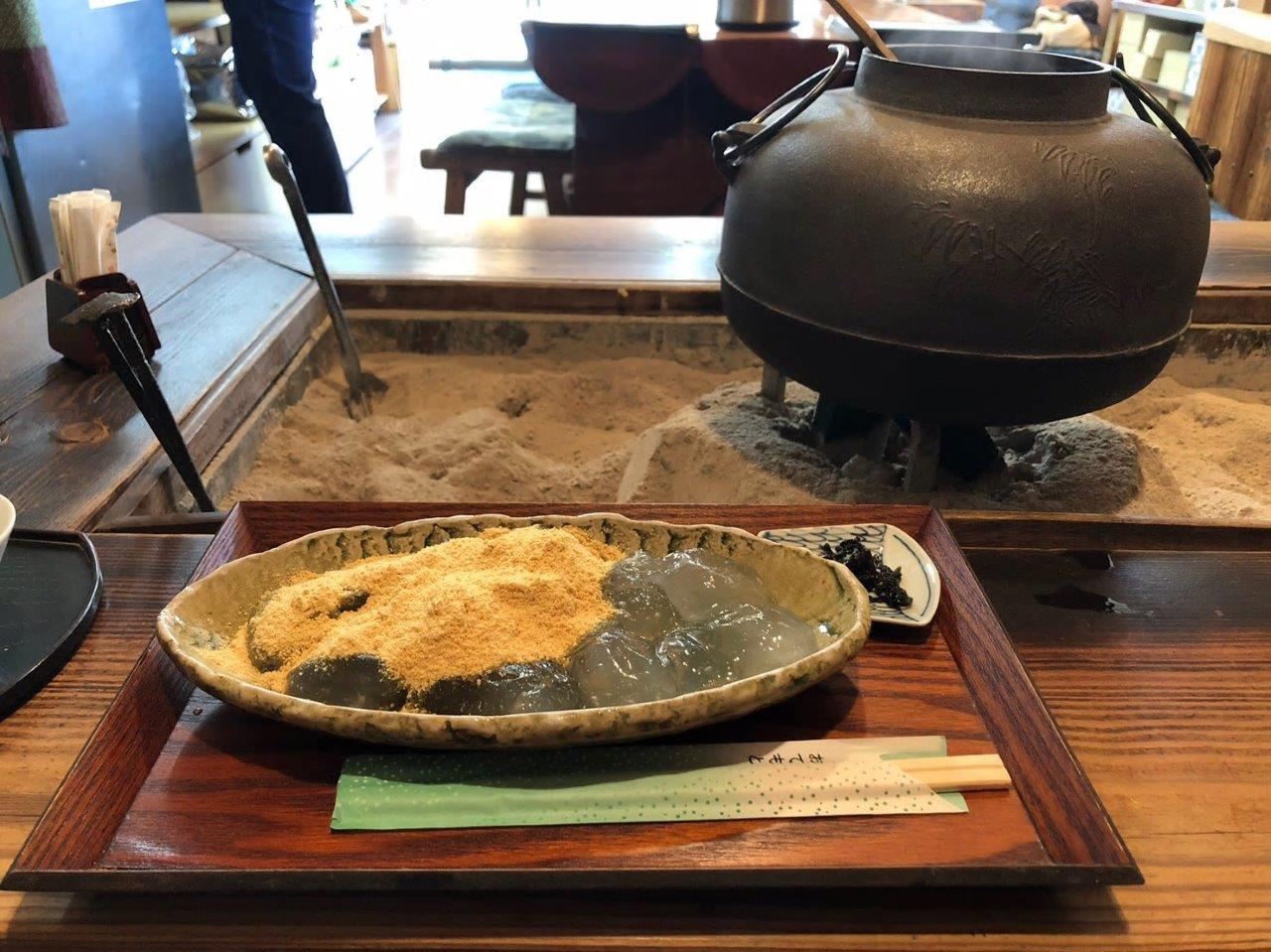 おはぎ、ぜんざい、わらび餅などメニューはかなり豊富で、僕は栗入りぜんざいと抹茶のセット、ひろりんはわらび餅とコーヒーを注文。
