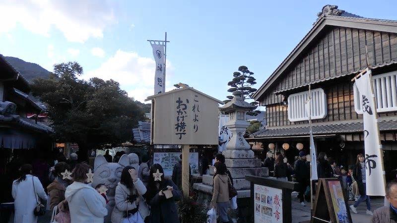 おはらい町は伊勢の名物・赤福(餅)の本店をはじめ、郷土料理の飲食店、雑貨・食材さらには伝統工芸など何十軒ものお店が並ぶ通りで、途中には「おかげ横丁」と言う名の伊勢エリアの代表建築物を再現した特別なエリアもあります。